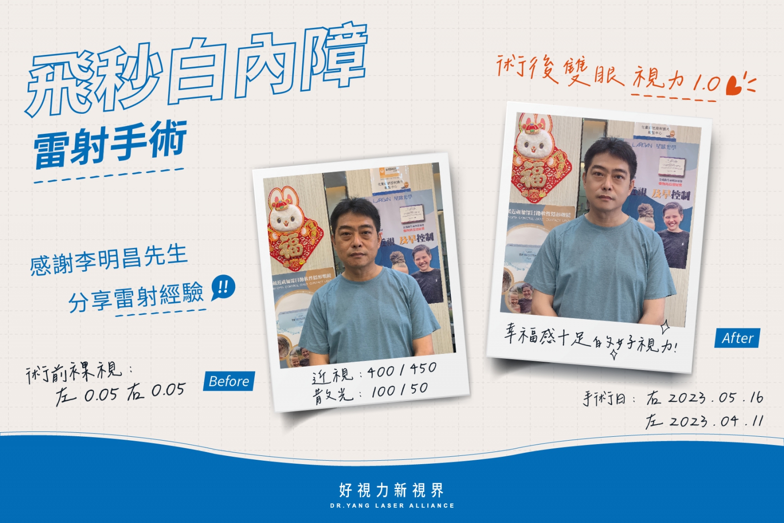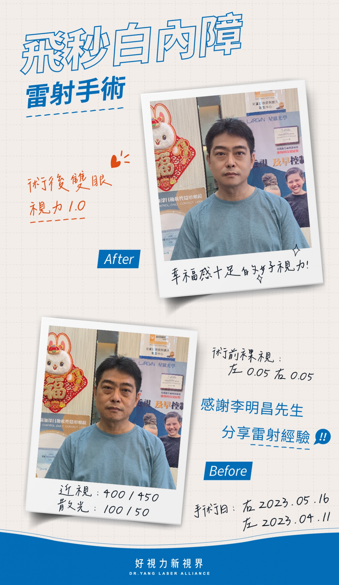 手術後我的恢復狀況良好,景色都看得清清楚楚,看字也不再像以前一樣,霧霧的看不到,對於我的工作來說,在施工現場或開車,看不清楚周遭環境是非常危險的,但自從白內障手術後,我的視力真的變得很清晰,對工作、生活都很便利,謝謝達特楊醫療團隊、楊志盛院長,以及專員美慧姐!
